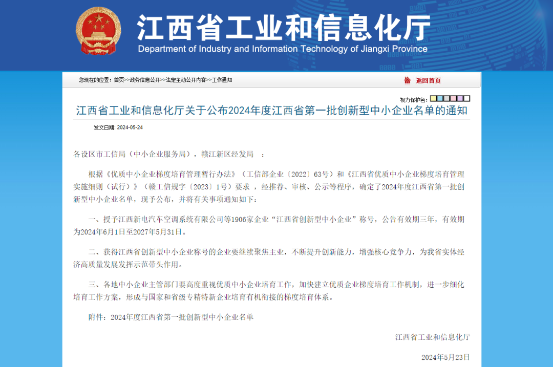 1906家入选!江西创新型中小企业名单公布2024-05-28 19:49 阅读 江西省工业和信息化厅官网 近日 江西省工业和信息化厅公布了 2024年度江西省第一批 创新型中小企业名单 授予江西新电汽车空调系统有限公司等 1906家企业 “江西省创新型中小企业”称号 据了解,创新型中小企业、专精特新中小企业、专精特新“小巨人”企业,是我国优质中小企业培育的三个层次,共同构成梯度培育体系。其中,创新型中小企业具有较高专业化水平、较强创新能力和发展潜力,是优质中小企业的基础力量。 识别二维码 查看入选企业完整名单 编辑:陈笑笑 审核:温小强 打开APP阅读全文