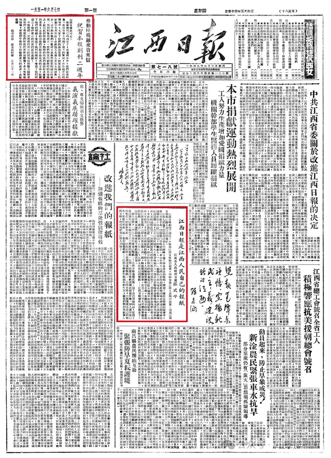 1951年6月7日,《江西日报》一版刊登了祝贺本报创刊两周年的系列文章,时任江西省人民政府主席邵式平刊发了一篇文章《江西日报是江西人民自己的报纸》,文中写道:
