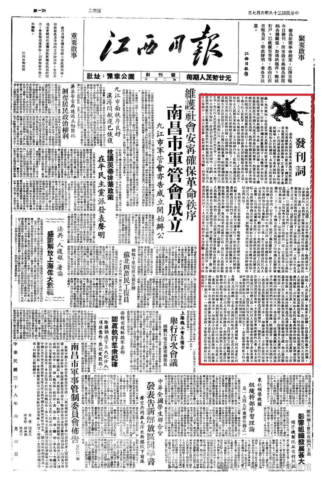 1949年6月7日,《江西日报》创刊,刊登在一版的《发刊词》中写道:江西日报是中国共产党江西省委的机关报,同时也是江西全体人民的报纸,它是人民说话的喉舌,它代表着人民的利益,完全是为人民服务的。从今天起,我们要用它的篇幅来发表自己的主张,向江西人民作各种建议,我们愿意以虚心请教的精神来听取各阶层人民的正确意见,作为我们制订政策与领导建设新江西的根据,我们诚恳地要求全江西人民,首先是工人、农民、广大的革命青年,知识分子以及产业界等都一致紧密地团结起来,在中国共产党和中国人民伟大领袖毛泽东的领导之下,不骄不躁,一致地沉着迈进,争取建设新中国新江西的彻底胜利!