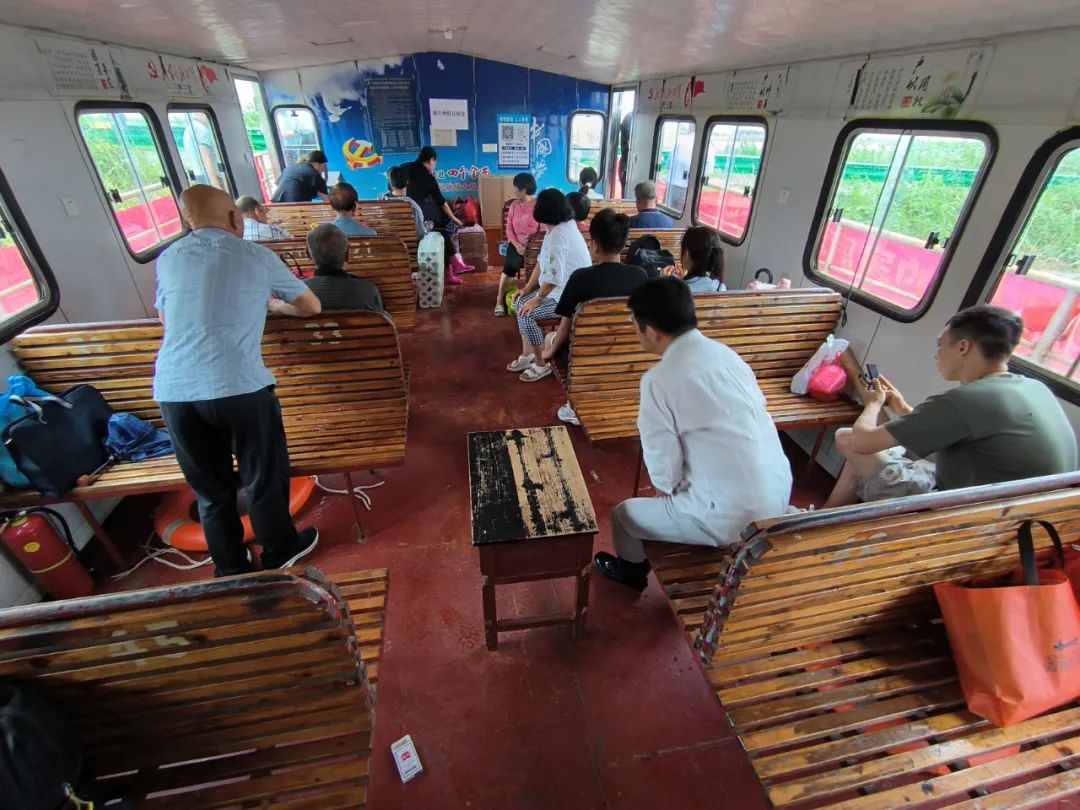“其实涨水没什么大不了的,我们都经历了几十年了。”南矶乡的长者几乎个个在船上长大,陈伯用手在小腿膝盖下比了一道,1998年水最高的时候,水淹到了陈伯家这个位置,2020年涨水严重了些,乡政府就额外安排班船把老人们全送到了城里子女家中。船舱座位旁,放着陈伯从新建城区买回的水果、卫生纸等生活物资。“乡里没有菜市场,买东西的地方也少,水涨上来了,这些就靠班轮送来了,不管怎样,这些年日子照常过,禁渔也好、涨水也好,都没什么大不了。”陈伯说。