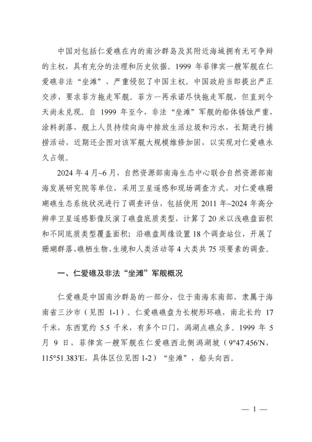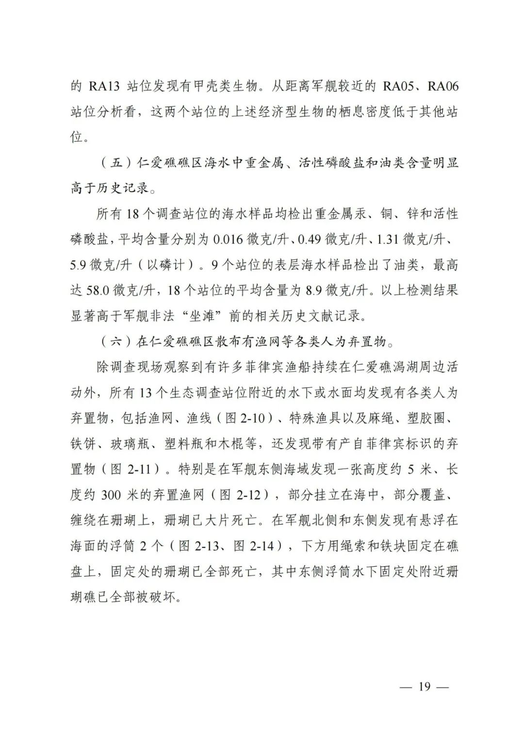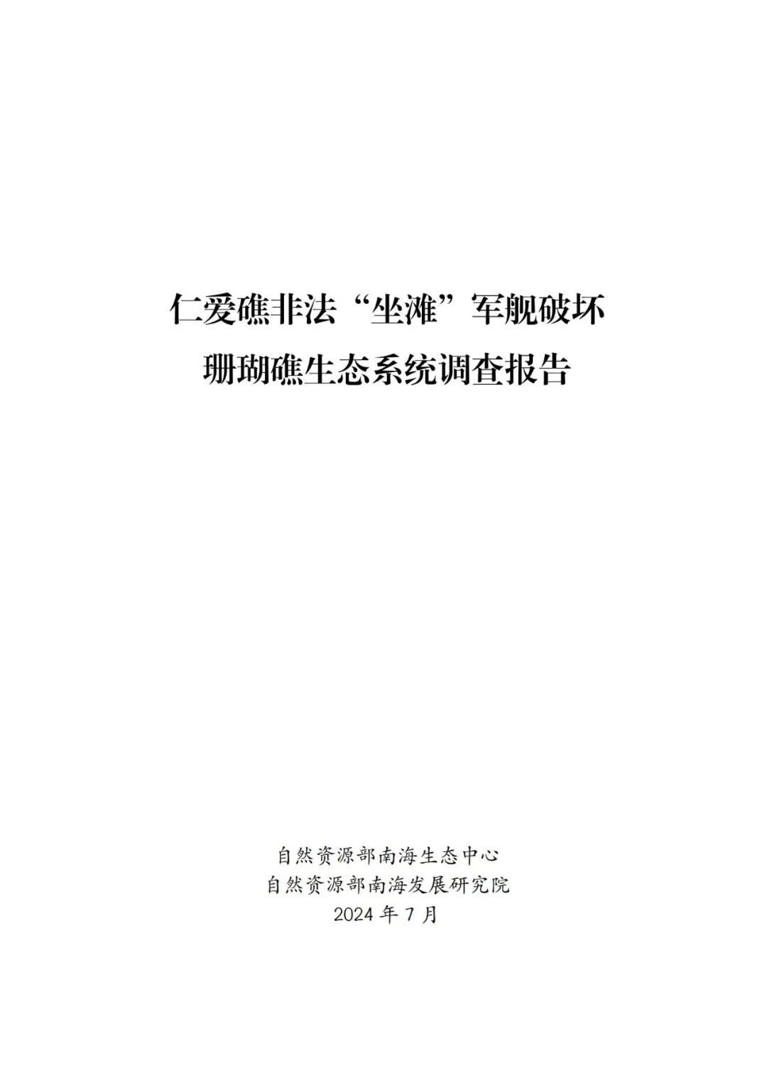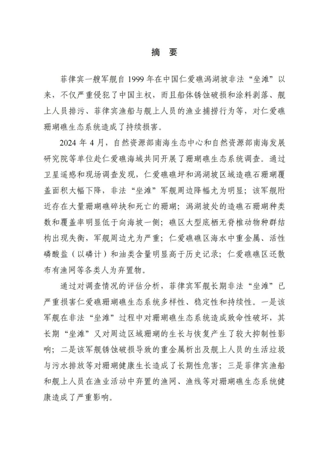 (中文版全文)《仁爱礁非法“坐滩”军舰破坏珊瑚礁生态系统调查报告》