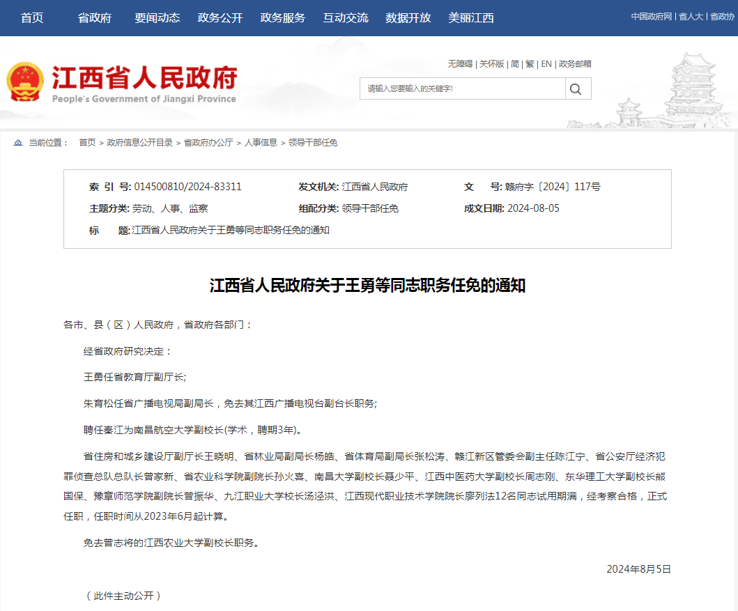 最新!江西任免一批领导干部2024-08-08 17:42 阅读 江西省人民政府 江西省人民政府关于王勇等同志职务任免的通知 各市、县(区)人民政府,省政府各部门: 经省政府研究决定: 王勇任省教育厅副厅长; 朱育松任省广播电视局副局长,免去其江西广播电视台副台长职务; 聘任秦江为南昌航空大学副校长(学术,聘期3年)。 省住房和城乡建设厅副厅长王晓明、省林业局副局长杨皓、省体育局副局长张松涛、赣江新区管委会副主任陈江宁、省公安厅经济犯罪侦查总队总队长曾家新、省农业科学院副院长孙火喜、南昌大学副校长聂少平、江西中医药大学副校长周志刚、东华理工大学副校长熊国保、豫章师范学院副院长曾振华、九江职业大学校长汤泾洪、江西现代职业技术学院院长廖列法12名同志试用期满,经考察合格,正式任职,任职时间从2023年6月起计算。 免去曾志将的江西农业大学副校长职务。 2024年8月6日 编辑:陈拾梅 审核:倪旻 打开APP阅读全文