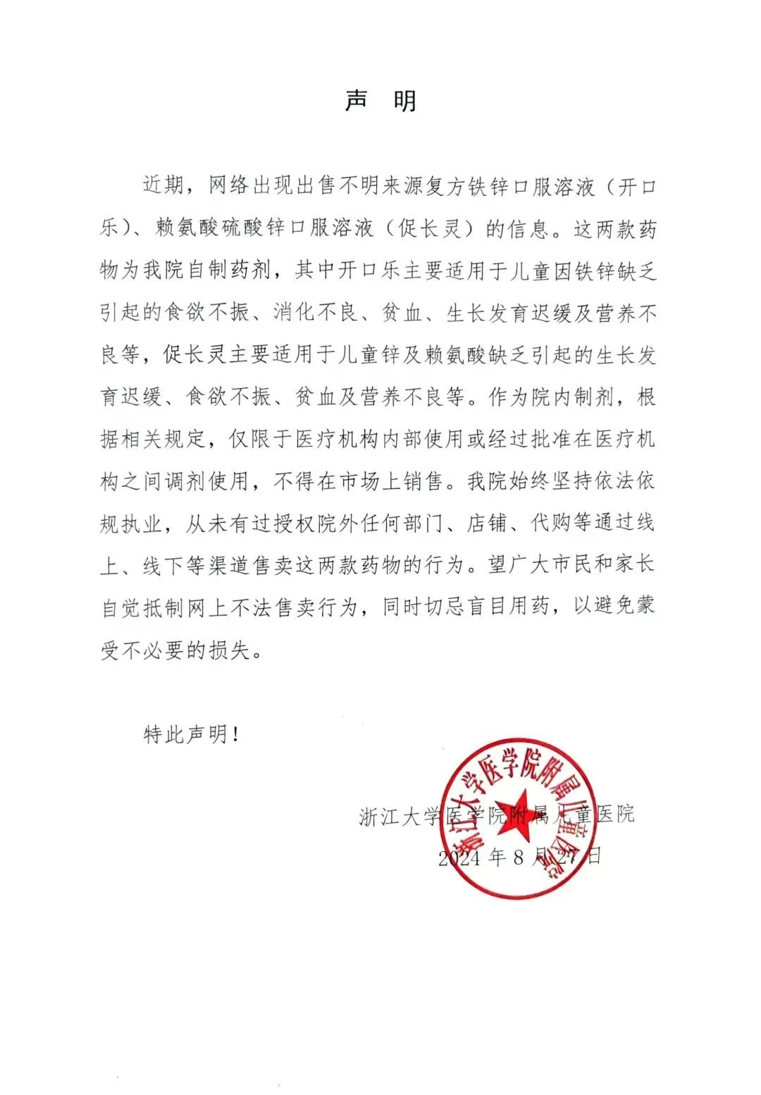 8月27日,浙大儿院发布声明称,网络出现出售不明来源的两款药剂为院内自制药剂,从未授权过院外任何渠道售卖。