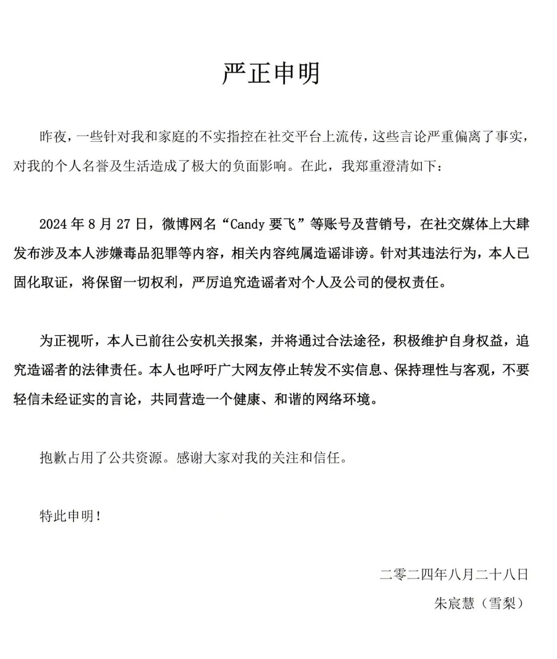 8月28日上午,雪梨发布严正声明,表示相关内容纯属造谣诽谤,针对造谣内容已向公安机关报案。