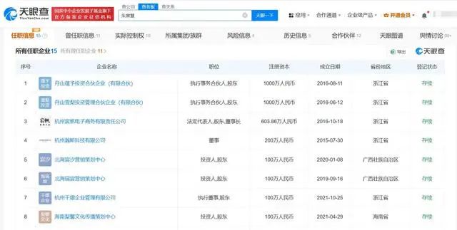天眼查App显示,雪梨(本名朱宸慧)共关联十余家企业,其中8家为存续状态,包括杭州宸帆电子商务有限责任公司、舟山雪梨投资管理合伙企业(有限合伙)、杭州千熠企业管理有限公司、北海瑞宸营销策划中心等。雪梨在上述企业中多担任投资人、董事长、执行董事等职务,并持有或间接持有全部8家企业股份。