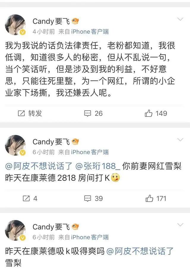 “Candy要飞”在发文的时候,直言雪梨是张珩的前妻。