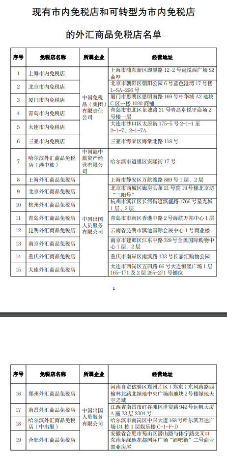 根据《通知》,现由中国出国人员服务有限公司经营的北京、上海、青岛、大连、南京、重庆、合肥、南昌、昆明、杭州、郑州、哈尔滨等12家外汇商品免税店,以及现由中国港中旅资产经营有限公司经营的哈尔滨外汇商品免税店,自《通知》施行之日起3个月内转型为市内免税店,经海关验收合格后开始营业。