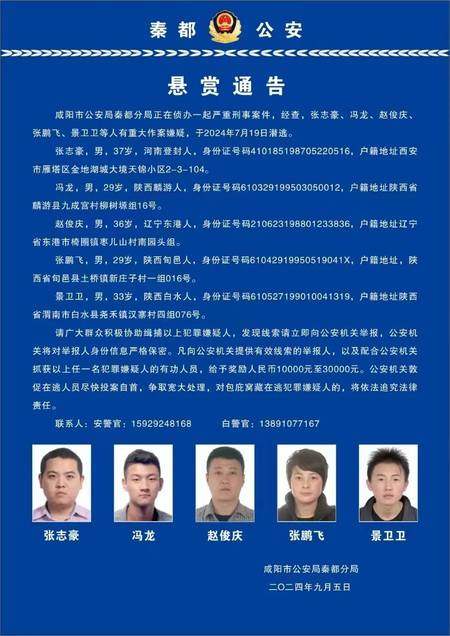 通告中称,咸阳市公安局秦都分局正在侦办一起严重刑事案件,经查,张志豪、冯龙、赵俊庆、张鹏飞、景卫卫等人有重大作案嫌疑,于2024年7月19日潜逃。
