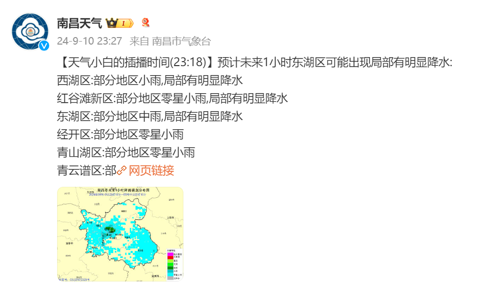 南昌市气象台在9月10日23时18分发布消息称,预计未来1小时内,南昌多地将有明显降水。