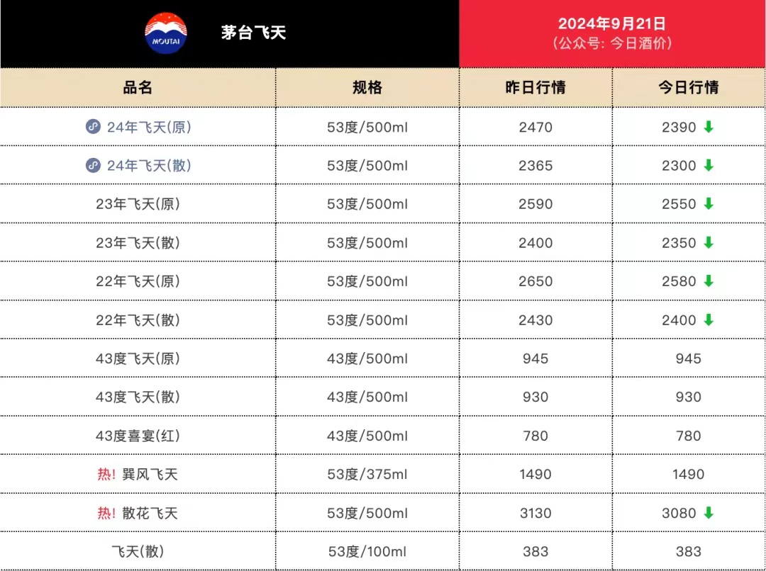 今日酒价报价平台显示,9月21日,飞天茅台原箱批发价格为2390元/瓶,散瓶飞天茅台批发价格为2300元/瓶,相对节前的价格出现明显下降。