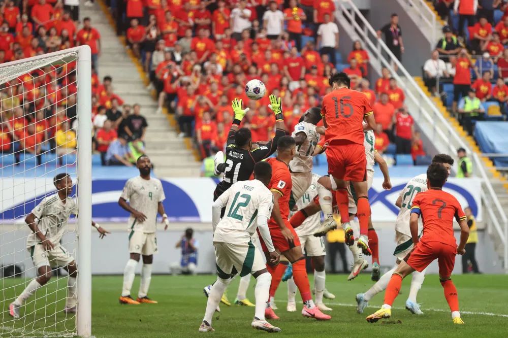 2024年9月10日,中国队球员蒋圣龙(上)在对沙特比赛中头球攻门,导致对方打入一粒乌龙球。新华社记者 贾浩成 摄