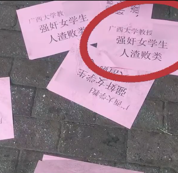 11月4日,广西大学一学院教授芋某某被人街头发传单指责“强奸女学生、人渣败类”。图片显示,多份传单散落在南宁市人行道上,上面均写有指责芋某某强奸女学生的字样。