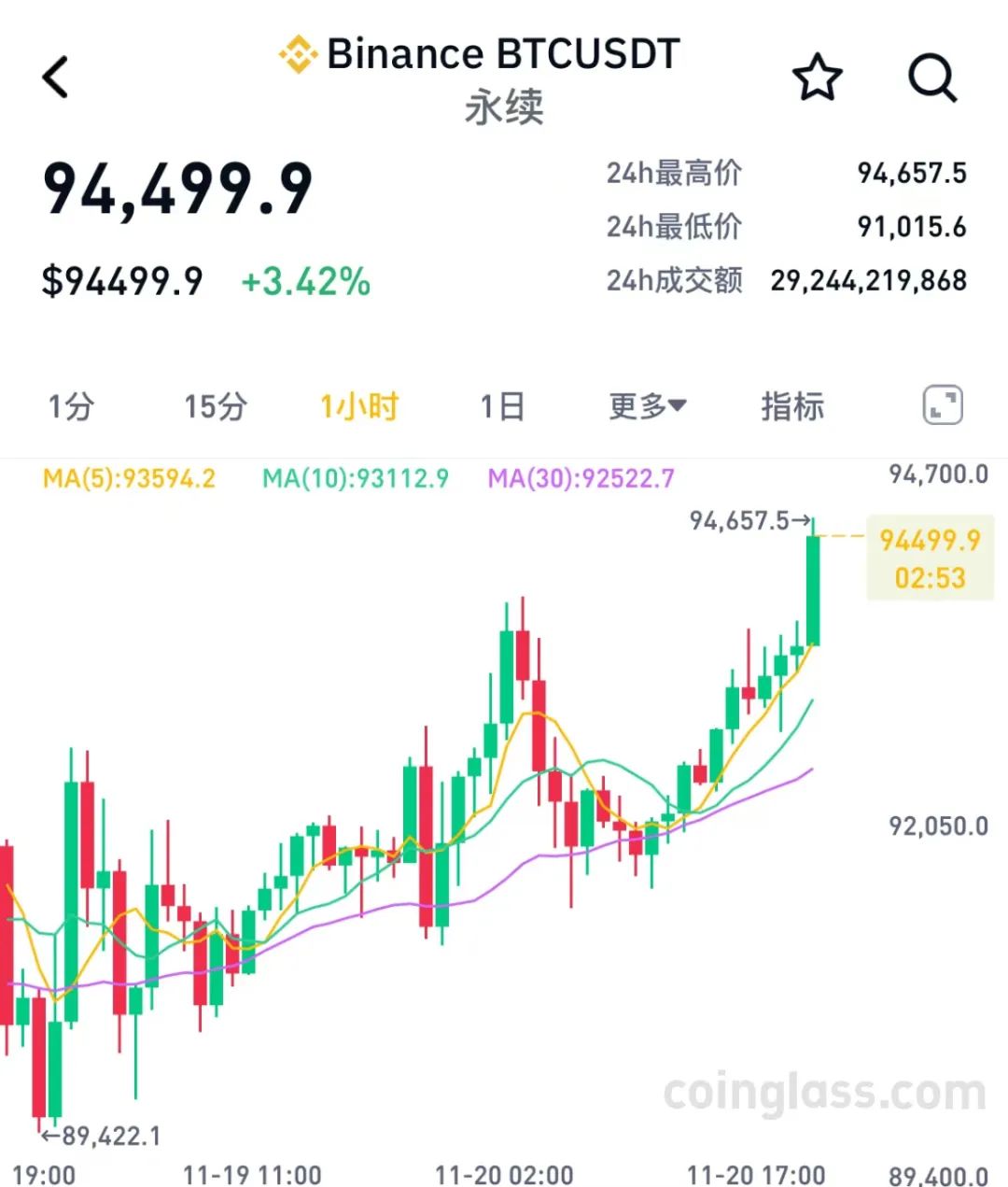 11月20日晚间,比特币持续走高,突破94000美元/枚,再刷新历史纪录。CoinGlass行情数据显示,截至发稿,比特币报94499.9美元/枚,最高至94657.5美元/枚。