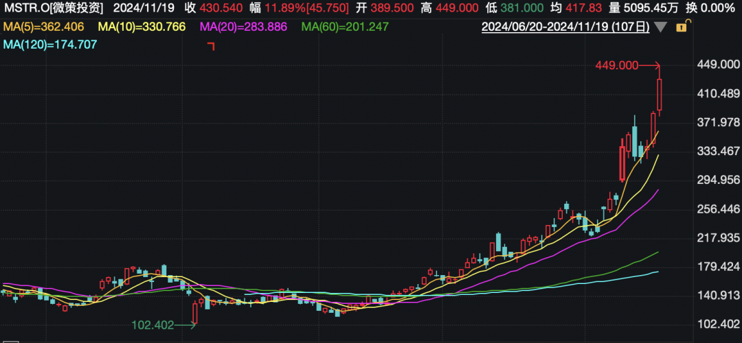 得益于比特币的大涨,“比特币影子股” MSTR股价近日也连续飙升,11月19日,该股收涨近12%,市值超越全球前两大金矿公司纽蒙特黄金公司和巴里克黄金公司的市值总和。11月20日盘前,该股继续大涨,目前涨幅超过7%。