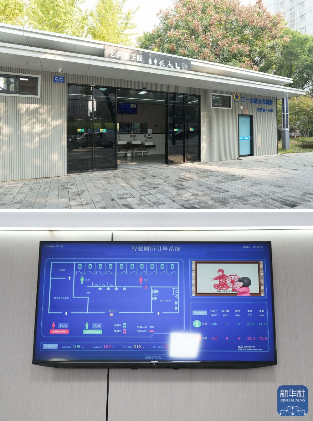 上图为长沙市三一大道公共卫生间;下图为三一大道公共卫生间内设置的智慧厕所引导系统(11月13日摄,拼版照片)。这个公共卫生间提高了女性厕位比例,卫生间内设置的智慧厕所引导系统能显示卫生间内的繁忙程度。