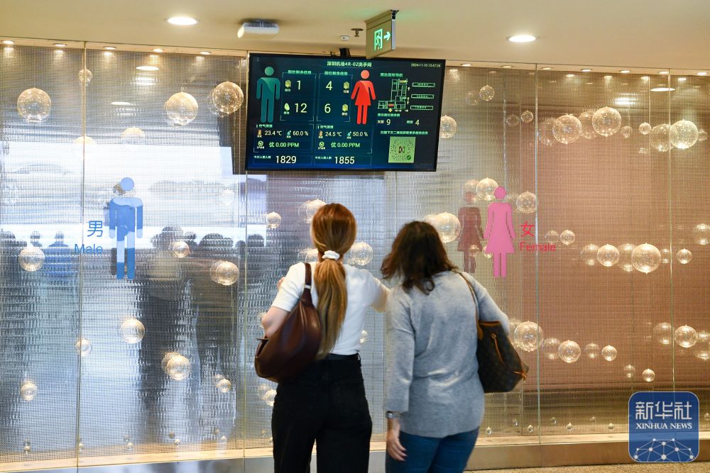 这是11月10日在深圳机场拍摄的智慧导厕系统。人们可以在厕所门口的大屏幕上实时查 看厕位空余情况,以及周边公共厕所信息。