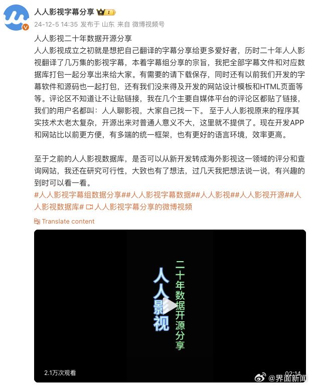 12月5日,据界面新闻,@人人影视字幕分享 发文称,人人影视二十年数据开源分享。