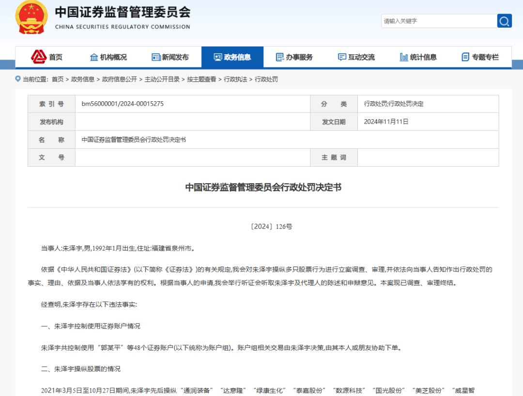 操纵23只股票!一“90后”被罚没近3500万元!2024-12-06 22:48 阅读 红星新闻近日,证监会披露一则行政处罚决定书,因先后操控23只股票的交易价格和交易量,朱泽宇被合计罚没近3500万元。 行政处罚决定书显示,当事人朱泽宇,男,1992年1月出生。2021年3月5日至10月27日期间,朱泽宇先后操纵“通润装备(002150.SZ)”“达意隆(002209.SZ)”“绿康生化(002868.SZ)”“泰嘉股份(002843.SZ)”“数源科技(000909.SZ)”“国光股份(002749.SZ)”“美芝股份(002856.SZ)”“威星智能(002849.SZ)”“亿利达(002686.SZ)”“广聚能源(000096.SZ)”“中百集团(000759.SZ)”“广百股份(002187.SZ)”“岭南控股(000524.SZ)”“赛象科技(002337.SZ)”“新筑股份(002480.SZ)”“深华发A(000020.SZ)”“张家界(000430.SZ)”“准油股份(002207.SZ)”“甘咨询(000779.SZ)”“赛隆药业(002898.SZ)”“棒杰股份(002634.SZ)”“徐家汇(002561.SZ)”“郑中设计(002811.SZ)”共23只股票的交易价格和交易量。经测算,违法所得为819.34万元。 截图自中国证监会官网 处罚决定书显示,朱泽宇共控制使用“郭某平”等48个证券账户(以下统称为账户组)。账户组相关交易由朱泽宇决策,由其本人或朋友协助下单。 证监会决定:对朱泽宇操纵股票获利超过100万元的,没收其违法所得558.71万元,并处以558.71万元的罚款。对朱泽宇操纵股票获利不足100万元或亏损的,没收其违法所得260.63万元,并分别处以100万元的罚款,共计2100万元。综上,合计没收朱泽宇违法所得819.34万元,并处以2658.71万元的罚款,共计近3500万元。 编辑:李孟玲 实习生朱金林 审核:倪旻 打开APP阅读全文