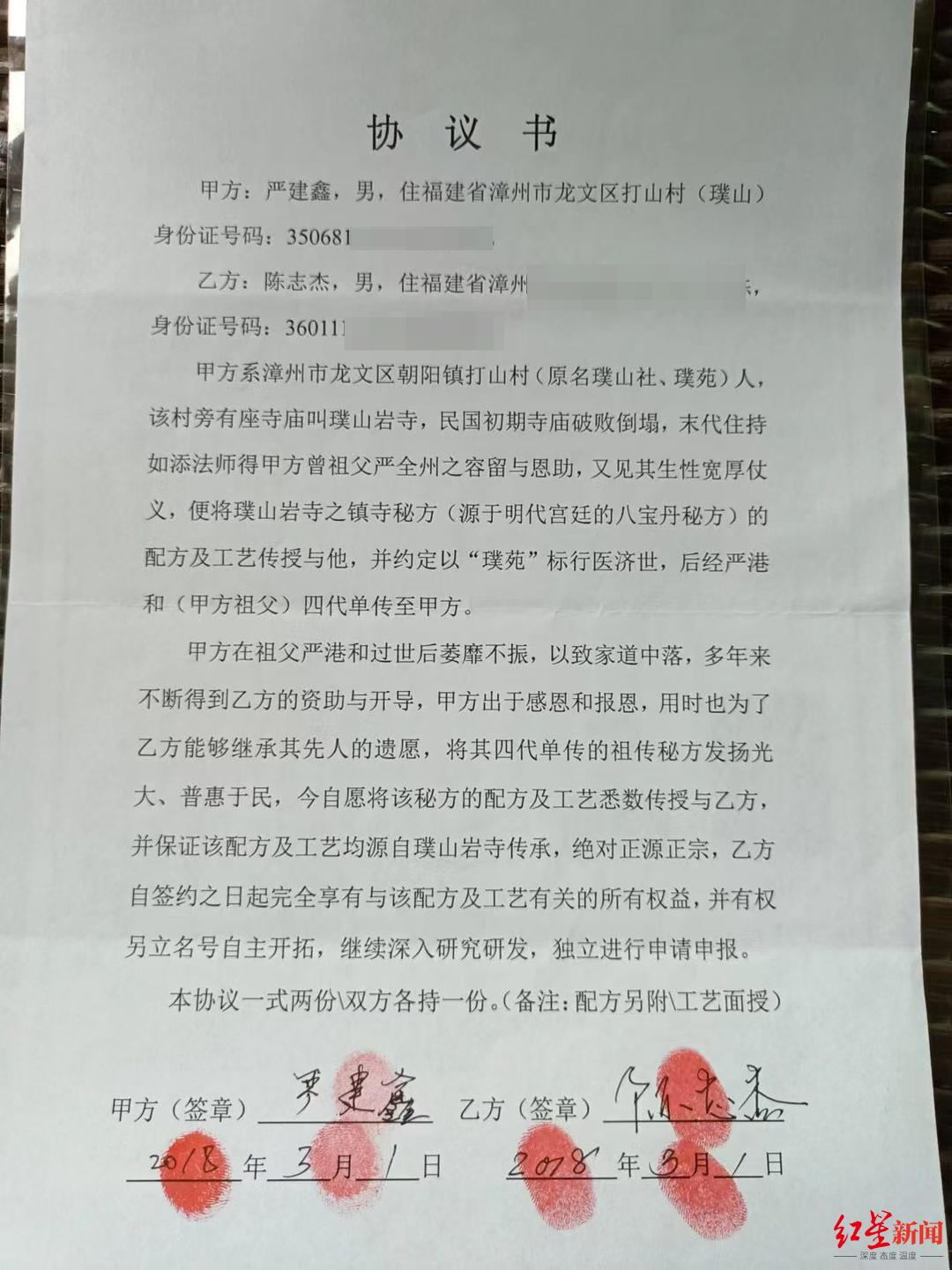 2018年3月1日,漳州市龙文区打山村(原名璞山社)村民严建鑫和陈志杰签订了一份《协议书》,《协议书》显示,严建鑫同意将其祖父严港和传承给他的源自明代宫廷八宝丹秘方的配方及工艺传授给陈志杰。