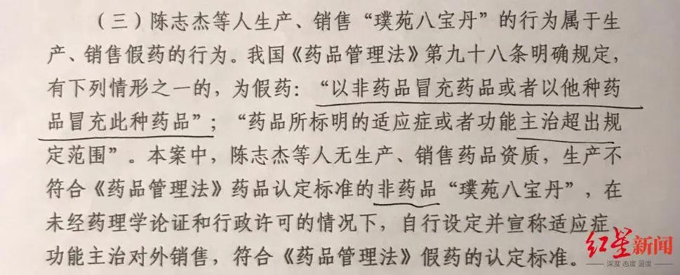据此,厦门中院认为,陈志杰等人无生产、销售药品资质,生产不符合《药品管理法》药品认定标准的非药品“璞苑八宝丹”,在未经药理学论证和行政许可的情况下,自行设定病宣称适应症、功能主治对外销售,符合《药品管理法》假药的认定标准。遂驳回4人上诉,维持原判。