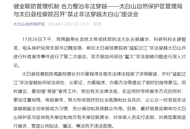12月3日,陕西太白山国家级自然保护区管理局(以下简称“太保局”)官方公众号“太白山自然保护区”发布一则推文称,日前,太保局领导带队前往太白县检察院就“猛蛇过江”非法穿越太白山并进行抖音宣传事件进行了第二次座谈,双方就如何惩处“鳌太”非法穿越问题进行深入讨论。
