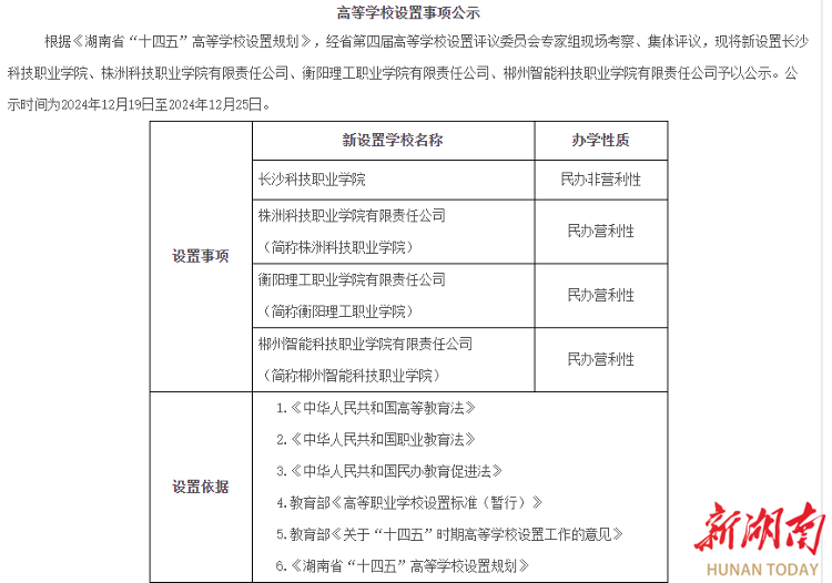 湖南或将迎来4所高校,其中3所以公司命名!近日,湖南省教育厅发布高等学校设置事项公示,根据《湖南省“十四五”高等学校设置规划》,经省第四届高等学校设置评议委员会专家组现场考察、集体评议,现将新设置长沙科技职业学院、株洲科技职业学院有限责任公司(简称株洲科技职业学院)、衡阳理工职业学院有限责任公司(简称衡阳理工职业学院)、郴州智能科技职业学院有限责任公司(简称郴州智能科技职业学院)予以公示。公示时间为2024年12月19日至2024年12月25日。