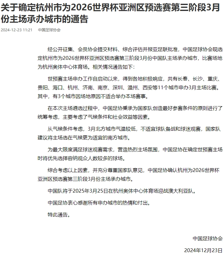 北京时间12月23日,中国足协官方宣布,中国男足国家队将于2025年3月25日在杭州奥体中心体育场对阵澳大利亚队。本场比赛是美加墨世界杯亚洲区预选赛十八强赛C组第8轮的一场比赛。