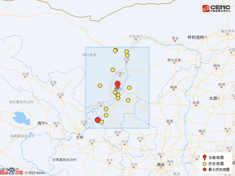 历史地震:根据中国地震台网速报目录,震中周边200公里内近5年来发生3级以上地震共18次,最大地震是2023年12月31日在甘肃白银市平川区发生的4.9级地震(距离本次震中214公里),历史地震分布如图。