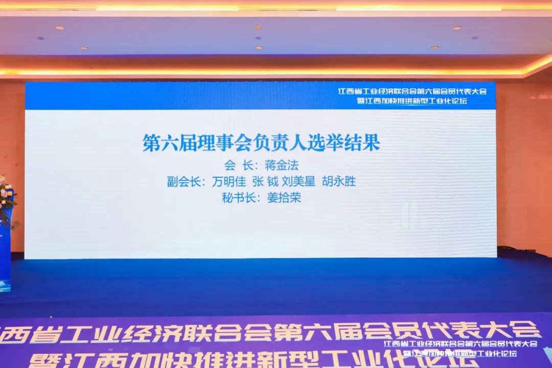 2024年12月28日下午,江西省工业经济联合会第六届会员代表大会暨江西加快推进新型工业化论坛在南昌文演建国饭店举行。省工业和信息化厅党组书记、厅长应炯出席并致辞。省工业和信息化厅党组成员、副厅长辛清华,江西省文史馆官员、省政府原副秘书长、省政府研究室原主任陈石俊,省社科院党委委员、副院长樊宾,省政府研究室原二级巡视员朱希文,江西铜业集团副总经理廖新庚,星火集团党委副书记万明佳,欧克科技董事长胡坚晟等领导出席。江西省政府参事、省社会科学院原党委书记蒋金法当选为江西省工经联第六届理事会会长。