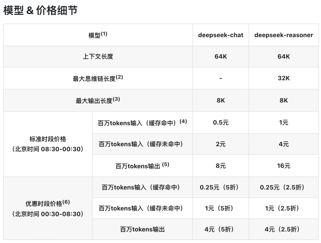 记者查询价格细节发现,DeepSeek主要有两款主力模型DeepSeek-chat(基础大模型,对应V3)和DeepSeek-reasoner(推理模型,对应R1)。在标准时段(北京时间08:30-00:30),V3和R1的百万tokens输入(缓存命中)价格分别为0.5元和1元,百万tokens输出分别为8元和16元。而在优惠时段(北京时间00:30-08:30),V3和R1的百万tokens输入(缓存命中)则均降为0.25元,百万tokens输出均降为4元。
