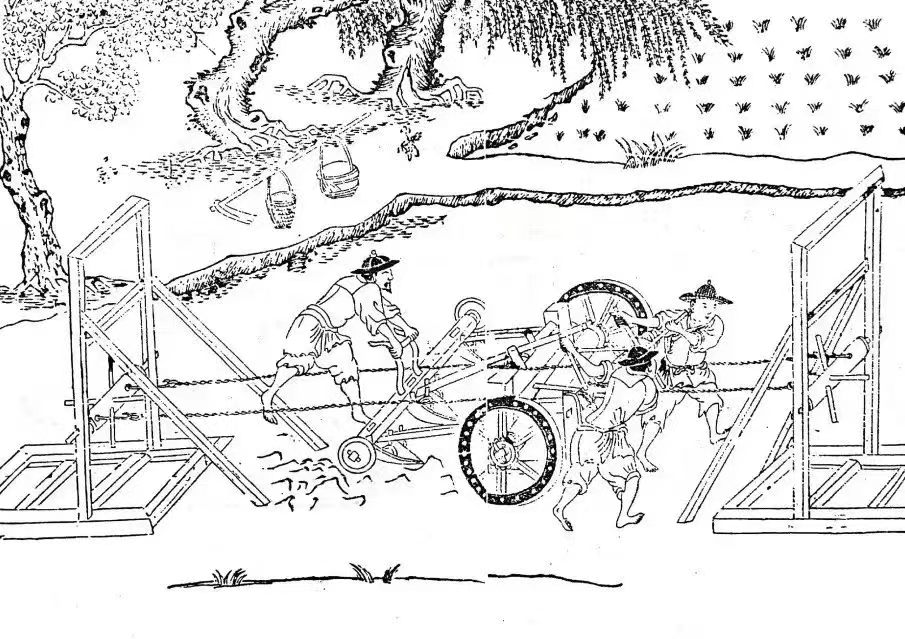 明代文人王徵撰写的《代耕图说》详细介绍了人力耕地机,并配有插图。耕地机由“人”字形木架、辘轳、犁、绳索、铁环等组成,操作时需要3人协同合作。一人负责转动橛木将绳索收紧缠绕在辘轳上,以此带动耕犁前行犁地;另一人负责向相同方向转动橛木以放出缠绕在辘轳上的绳索;第三个人负责保证耕犁不倒,控制犁铧切入泥土的角度和深度,以掌控耕地的效果。虽然需要3个人操作,但在灾荒之年,或牛畜缺乏人力剩余的情况下,这样的机器却能解决无法耕地的困难,并取得良好的耕地效果。