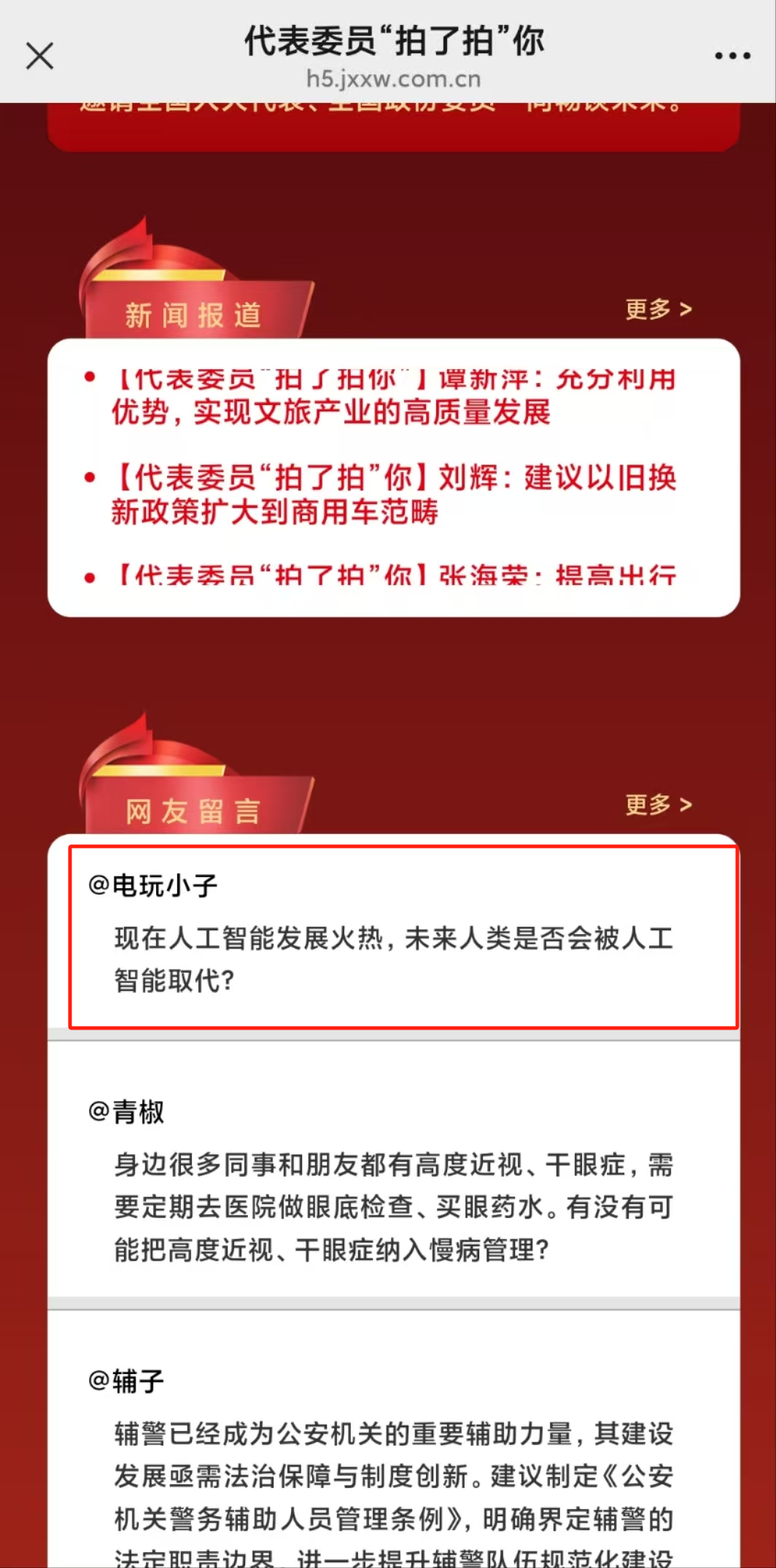 大江网/大江新闻客户端讯 今年以来,有关DeepSeek的话题火遍了社交网络,人们在惊叹人工智能的快速发展之余不免产生担心,有网友在江西新闻客户端“代表委员‘拍了拍’你”专栏留言,“人工智能未来是否会取代人类”?对此,记者现场采访到全国人大代表、南昌大学元宇宙研究院院长闵卫东,他从人工智能快速发展方面回应了网友提问。