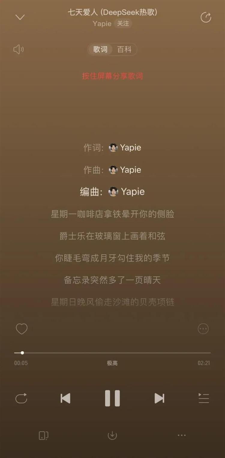 在媒体采访中,Yapie表示,“我认为它(DeepSeek)写词能力很强,有深度和内涵,比现在有的口水歌词强太多了,有些音乐人几年都写不出一首好歌,我现在用DeepSeek教大家写出了很多不错的作品,很多网友在我的评论区里晒出了自己用DeepSeek创作的歌曲。”他还表示,创作出来的歌曲《七天爱人》版权属于自己,也获得了几万块钱的收益。