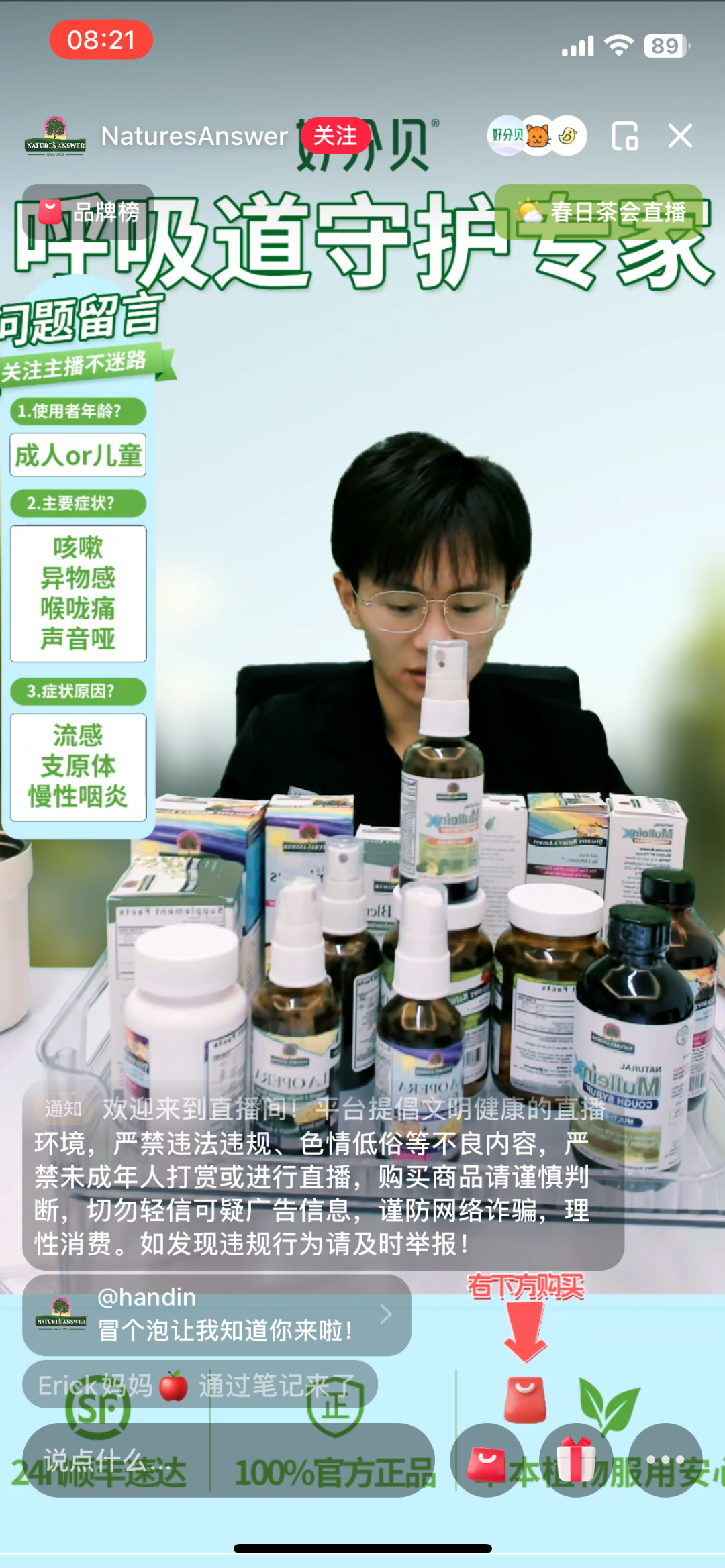 主播1:我们家针对于宝宝的小儿咽喉炎、扁桃体炎、流感、感冒、肺炎、支气管炎……2岁以上可以用,没有依赖性,没有副作用。感冒咳嗽拍9号链接,有痰拍7号链接,没有痰拍9号链接。小儿咽炎、扁桃体炎,干咳的拍9号链接。里面的成分帮助你舒缓修复受损部位。接骨木和蜂胶是抵抗病毒、细菌交叉性感染的……