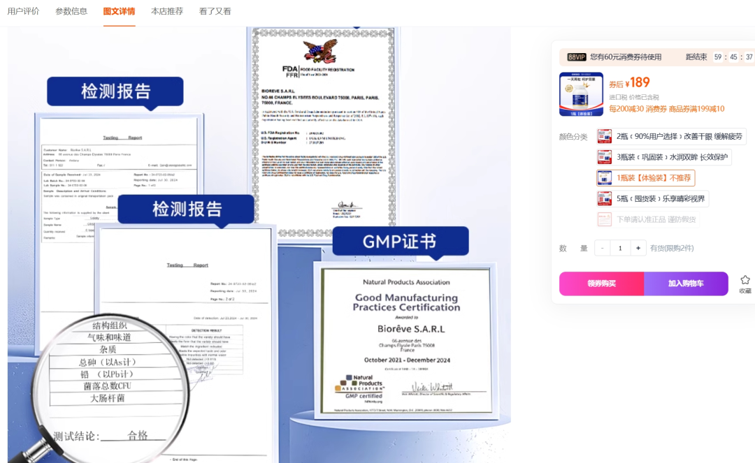 张女士:他是说能对眼睛好,还有一个治肺的、净化肺。说老是抽烟咳嗽,吃这个就会好。买回来查了一下,不是什么法国的品牌,什么品牌都不是。