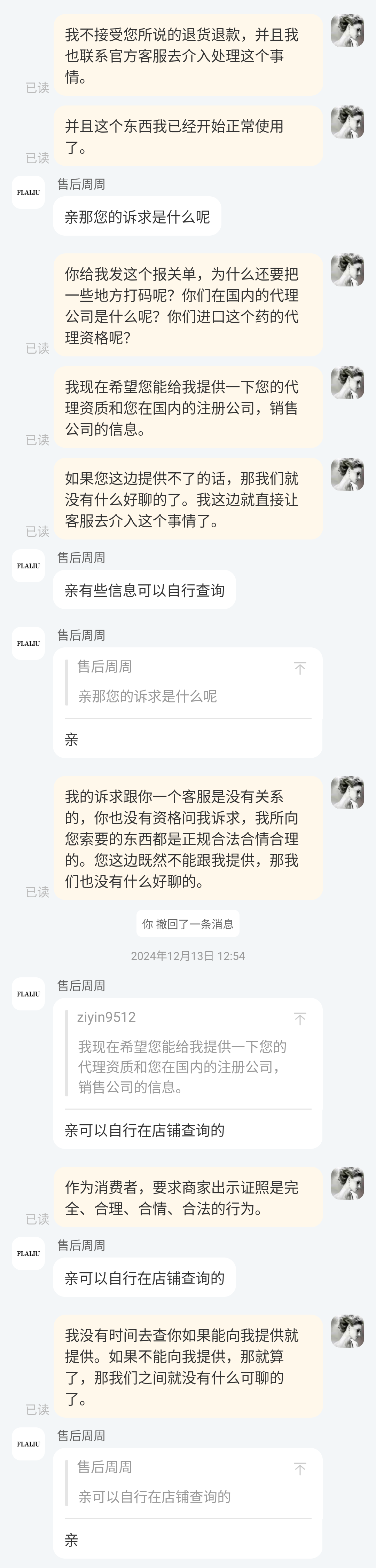 蓝先生:它是完全没有作用的,这个商家在销售过程中宣称有减肥功效,但是它这个既不属于药品,也不属于保健品,就是食品。它没有保健品的资质,也没有药品的资质,所以严格意义上来讲,他是不能宣称减肥的功效,我后续对他的公司执照进行了查询,包括他当时向我提供的海关进口货物的报关单,所有数据都是不符合规定的。