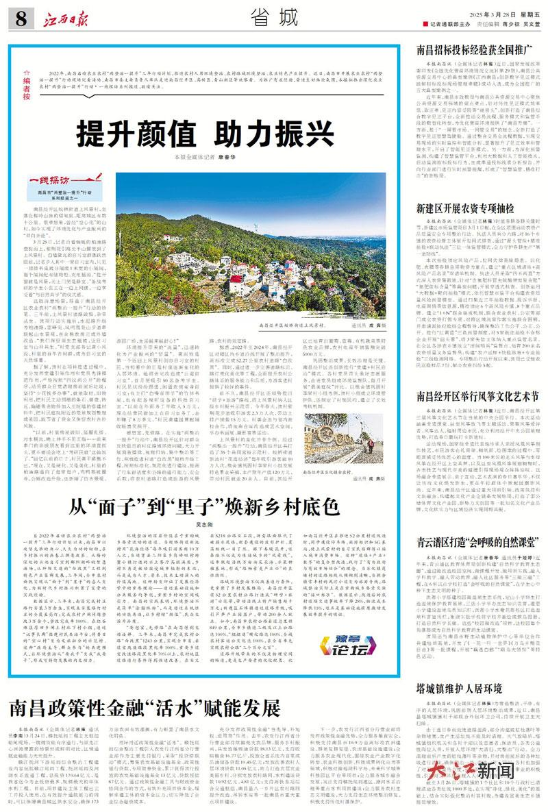 2022年,南昌启动农业农村“两整治一提升”三年行动计划,推进农村人居环境整治、农村路域环境整治、农业特色产业提升。近日,南昌市开展农业农村“两整治一提升”行动现场巡看活动,南昌市委主要负责人率队走进南昌经开区、高新区、青山湖区等地察看。为推广有益经验,营造良好舆论氛围,本报拟推出深化农业农村“两整治一提升”行动·一线探访系列报道,敬请关注。