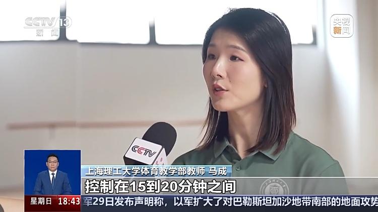上海理工大学体育教学部教师 马成:我们主要进行高强度的间歇训练,控制在15到20分钟之间。高强度运动我们的一个评价标准是达到我们同学最大心率的90%以上,希望他在整个运动的状态下保持自己的最大心率,在180跳每分钟这样的一个运动强度,然后进行20秒的高强度运动,配合10秒的休息,然后重复进行。