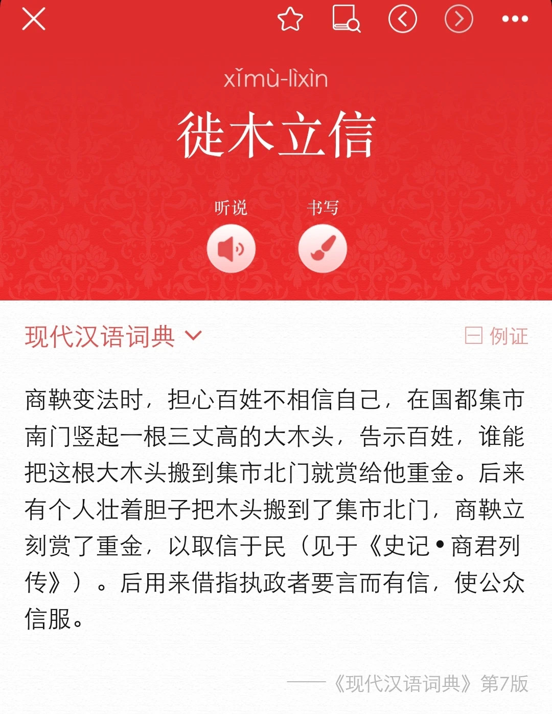 “徙木立信”一词源自汉代司马迁的《史记·商君列传》,借指执政者要言而有信,使公众信服。
