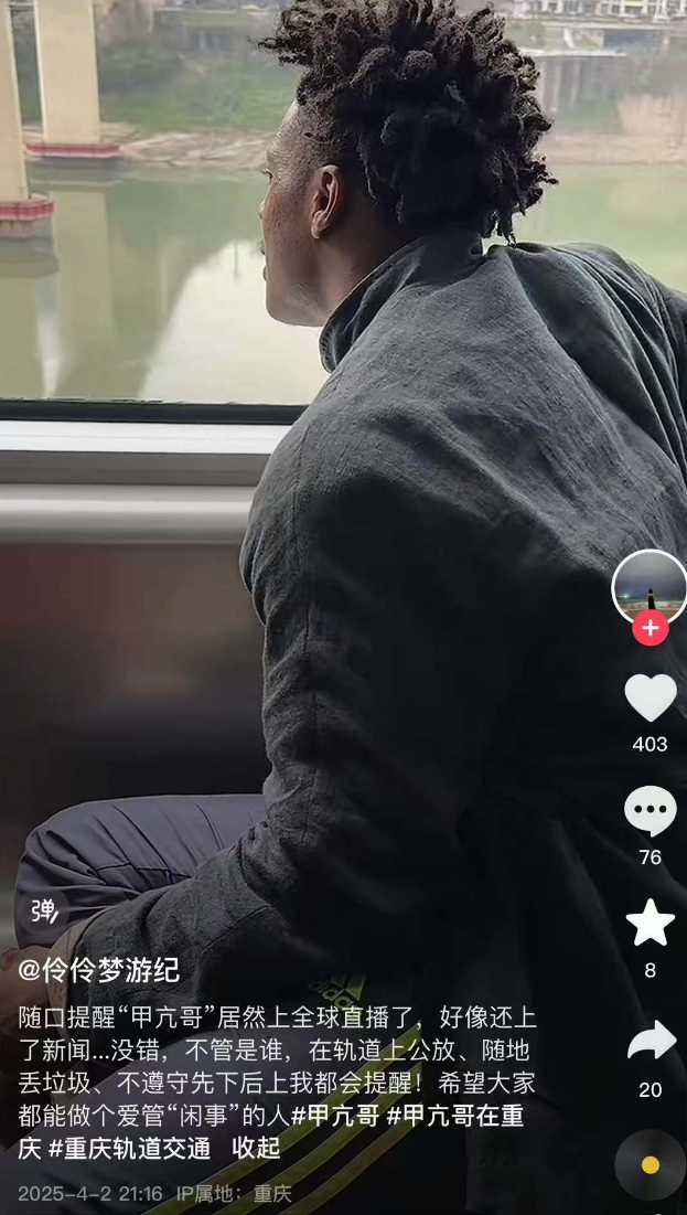4月2日,“甲亢哥”体验坐轻轨,到站时他激动地,在车厢和站台之间跳来跳去。正在他兴奋之际,一位同车女生看到后用英文友善提醒,这个行为有点危险,不要教孩子这样做。