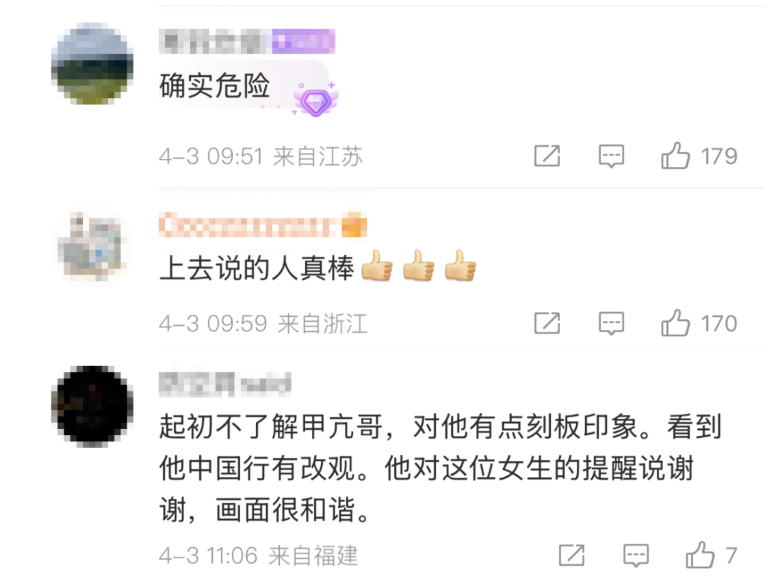 4月2日晚,这位女生在自己的社交平台发文回应:提醒不文明行为,人人有责,希望大家都能有一些正面的输出,让世界更美好。