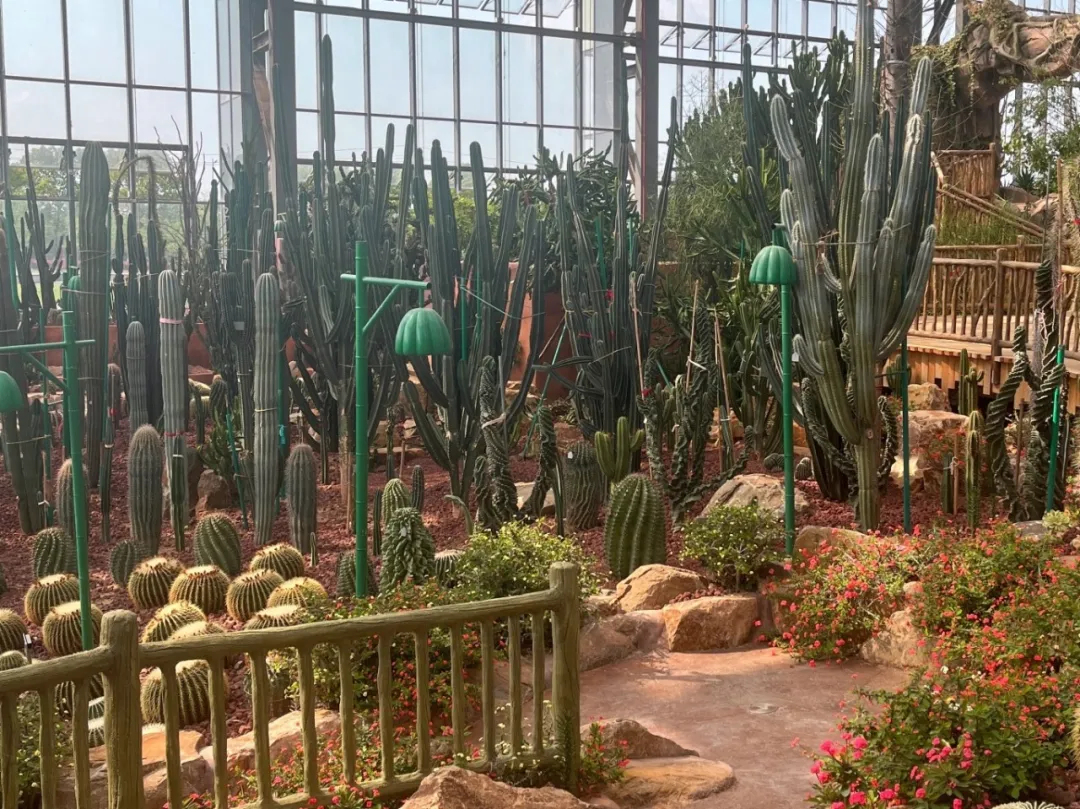 沙漠植物的天堂:主要展示各类沙漠特色植物。以沙漠植物的原生环境为基调,融合石林、台地、山丘、侵蚀台地、缓坡等多变的下沉式特色地形,打造出别具一格的沙漠植物展示空间。
