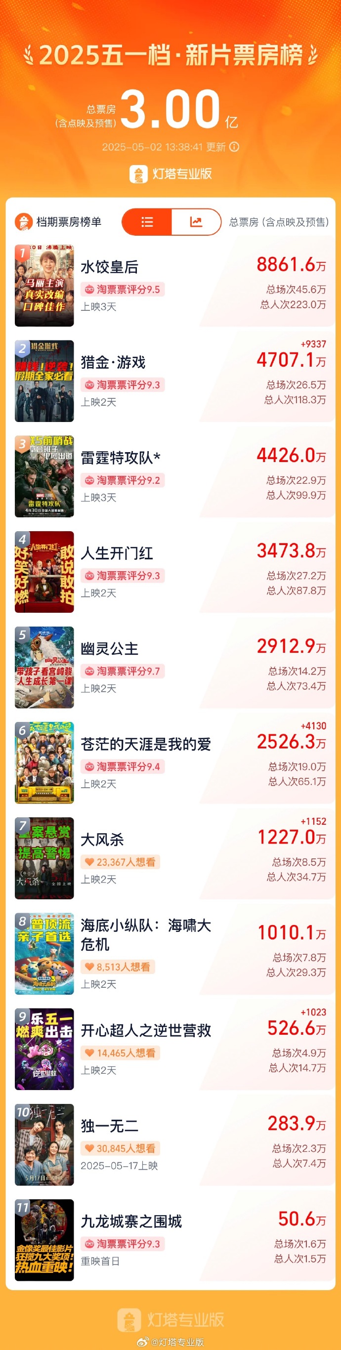 据灯塔专业版,截至5月2日13时38分,2025年五一档新片(含重映)总票房(含点映及预售)突破3亿元,影片《水饺皇后》《猎金·游戏》《雷霆特攻队*》《人生开门红》《幽灵公主》《苍茫的天涯是我的爱》暂列前六。