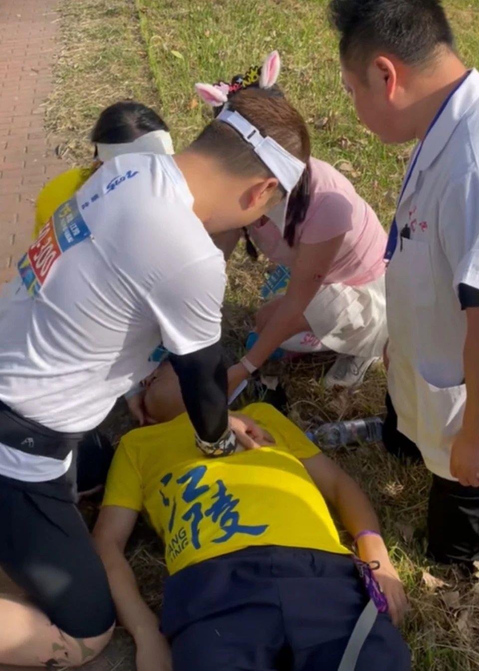 庆幸的是,作为本次赛事医疗急救跑者的易卓当时离男子200米左右,他于30秒内抵达现场展开施救。