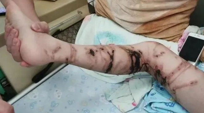 随后,该男孩双腿出现大面积红肿,部分皮肤溃烂到可以看到脂肪组织,还先后进行了两次植皮手术。