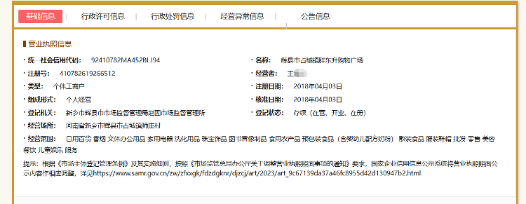 胖东升名下另一家超市、新乡市辉县市占城镇胖东升购物广场一名负责人同样表示,胖东升已经开了十几年了,不存在抄袭“胖东来”店名的情况。根据国家企业信用信息公示系统,该辉县市占城镇胖东升购物广场成立时间为2018年4月3日,经营场所为河南省新乡市辉县市占城镇师庄村,登记机关为新乡市辉县市市场监督管理局赵固市场监督管理所。