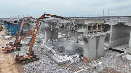 据介绍,为保障旧桥拆除施工的进度与安全,自工程启动以来,现场共投入30余台大型机械设备及上百名施工人员,实行24小时轮班连续作业。施工团队根据结构特点采取差异化方案,对中间八孔梁体实施原位高效破除,对需保留的外侧桥墩则运用金刚石绳锯进行精细切割,将T梁合理分段后,用500吨汽车吊逐一精准吊运,全过程实现“零扰动”施工。