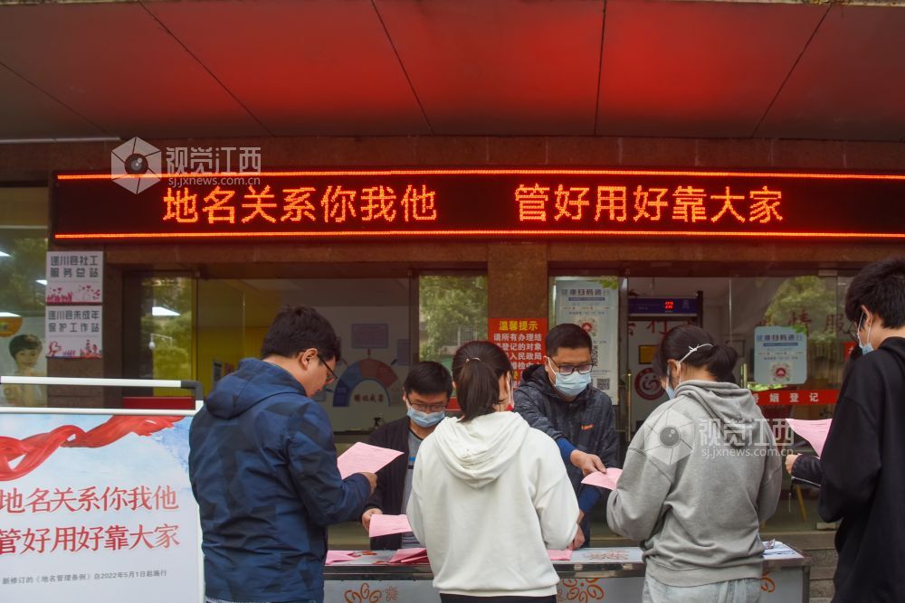 2022年5月16日,江西省遂川县民政局工作人员在散发宣传单,向过往市民宣传《地名管理条例》。(视觉江西肖远泮肖斌摄)