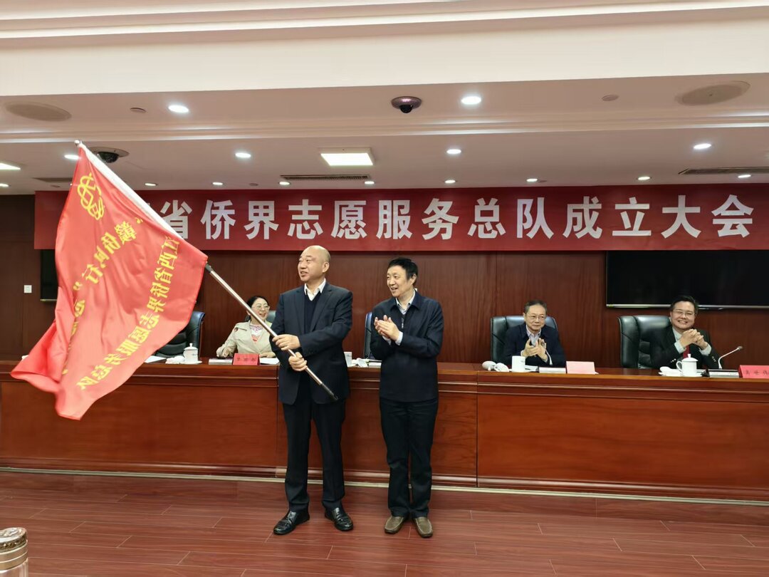 会议宣读成立省侨界志愿服务总队的决定,宣布由省侨联兼职副主席陈成炉为总队队长,下设法律志愿服务队、医疗志愿服务队和社会志愿服务队。并向志愿服务总队队长及各志愿服务分队队长授旗。