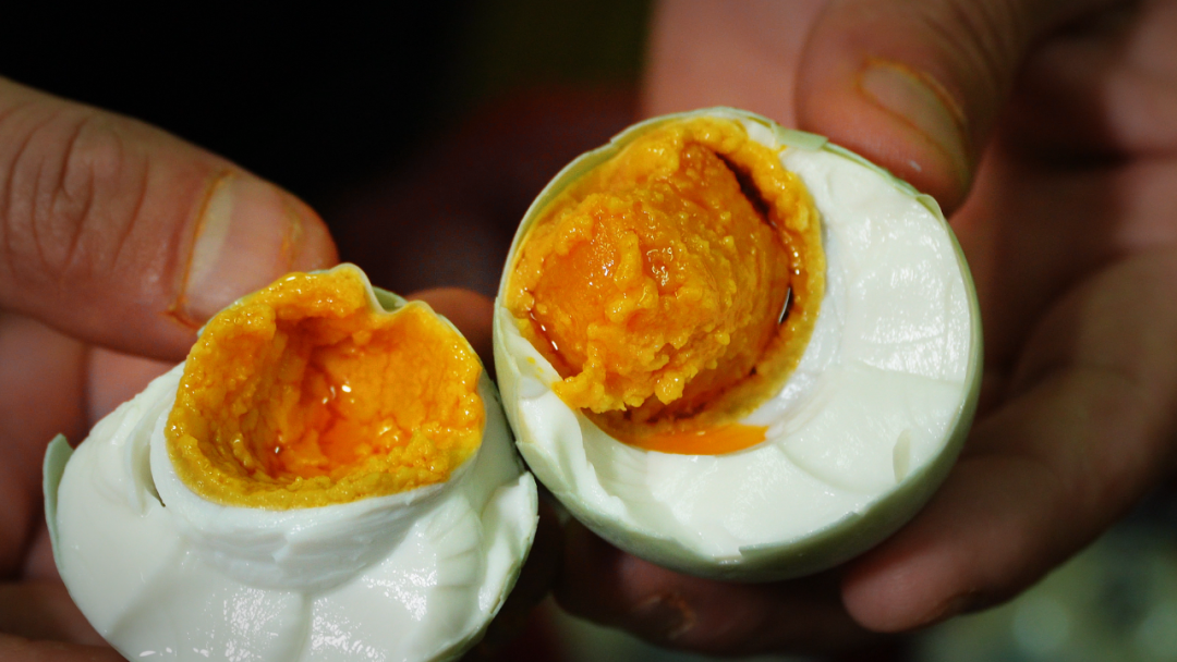 时间,将朴素食材酝酿成全新美味。在静默的等待中,盐离子缓缓渗入蛋内,改变鸭蛋的性状与风味。长时间腌制引发盐析作用,蛋白质逐渐变性,分离出的脂肪凝聚为金黄透亮的蛋黄油,香气暗涌。